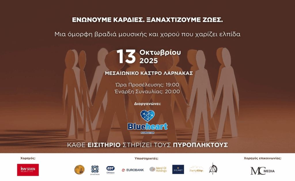 Στο Μεσαιωνικό Κάστρο Λάρνακας, στις 13 Οκτωβρίου, μεταφέρεται η μεγάλη βραδιά του Blue Heart Foundation που είναι αφιερωμένη στους πυρόπληκτους, που μέσα στο καλοκαίρι που πέρασε δοκιμάστηκαν σκληρά από τις φλόγες.