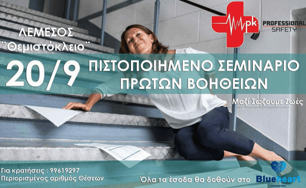 Στα πλαίσια της εταιρικής κοινωνικής ευθύνης ο οργανισμός PK PROFESSIONAL SAFETY διοργανώνει πιστοποιημένο σεμινάριο Πρώτων Βοηθειών, με όλα τα έσοδα να κατατίθενται για το έργο και τις δράσεις του Blue Heart Foundation.